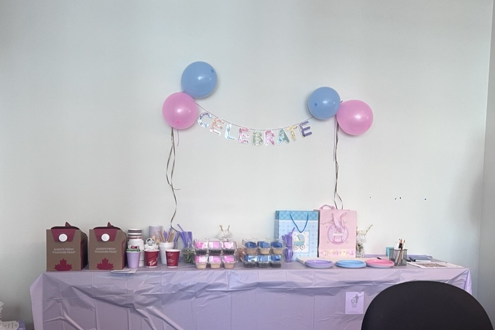 A table of treats and gifts to celebrate my and another colleague's pregnancy.